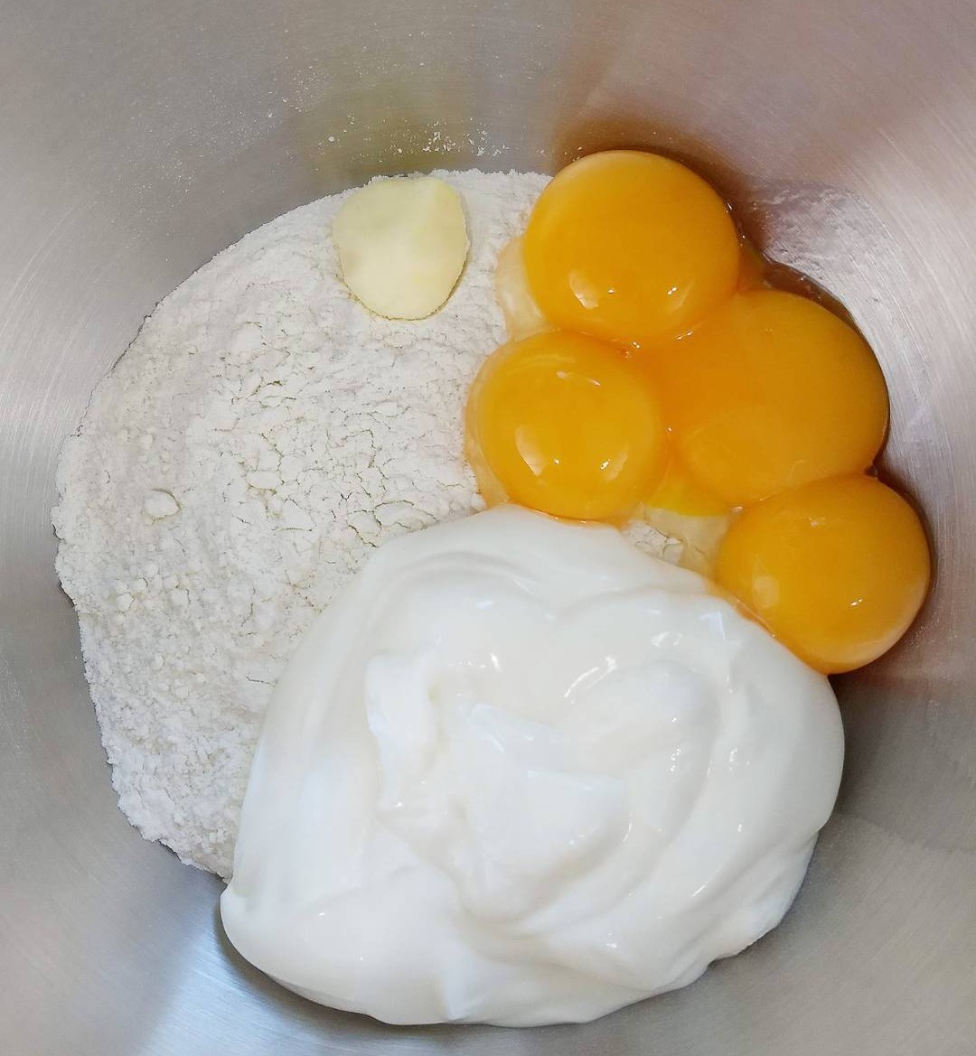 W misce mieszamy mąkę, żółtka, śmietanę, masło, spirytus i sól. Zagniatamy i wyrabiamy ciasto, aż będzie idealnie gładkie.