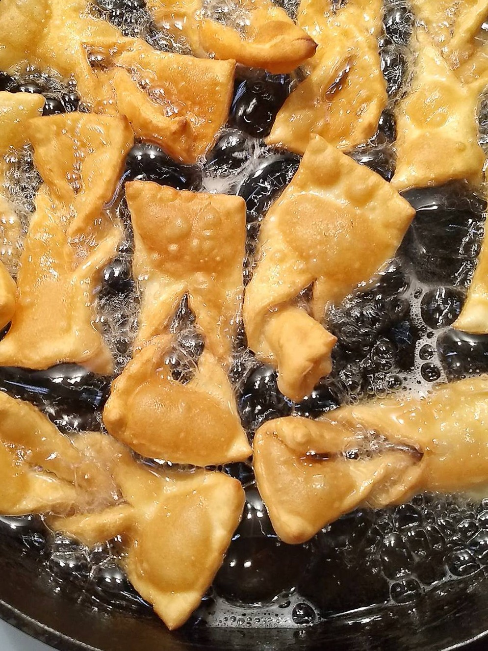 Smażymy na rozgrzanym oleju lub smalcu na złoty kolor po obu stronach i odsączamy na papierowym ręczniku. Po odsączeniu posypujemy cukrem pudrem.